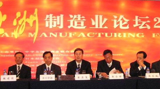 写真左から、中国商務省大臣・古川令治氏(現本会代表)・工商連主席・郭台銘氏(シャープと提携した台湾著名企業代表)他