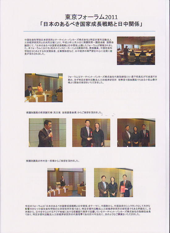 2011年11月25日特定非営利活動法人三田経済研究所、中国社会科学院日本研究所、マーチャント・バンカーズが主催。前原誠二衆議院議員他が来賓挨拶。